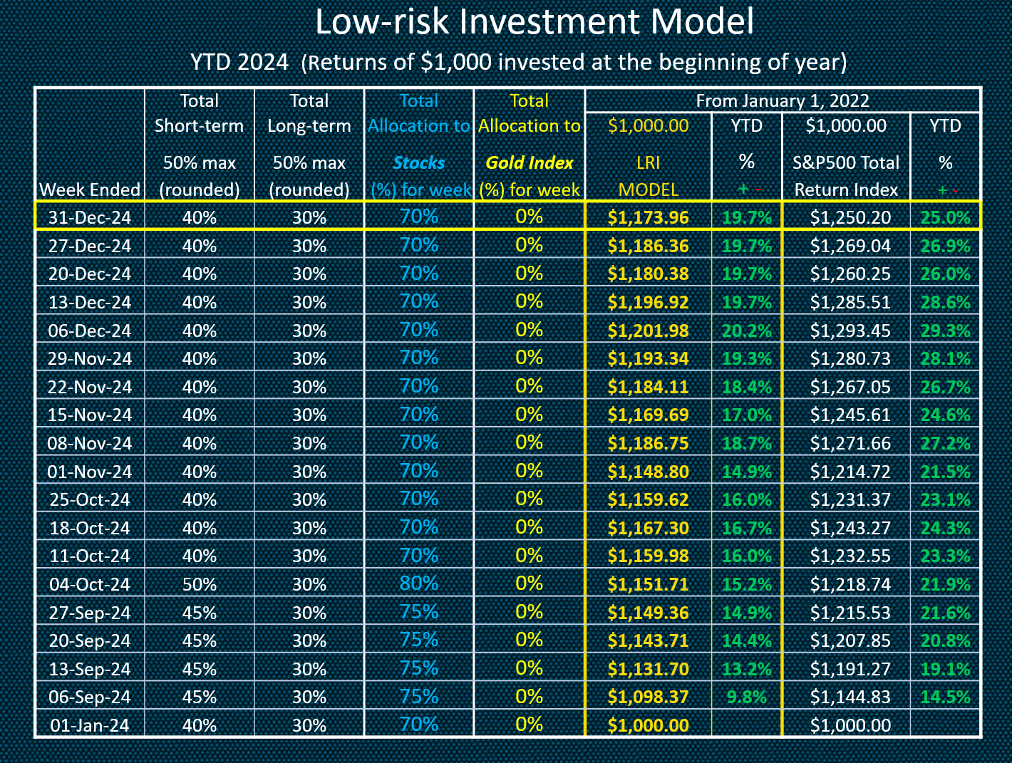 I changed the weekly updates back in 2014 to what I believe is a more accurate measure of actual performance. Instead of using just then regular S&P 500 Index, I now use the S&P 500 Total Return Index which includes all dividends. This is a better gauge of actual performance and allows anyone to compare his or her year-to-date portfolio results with the Model.